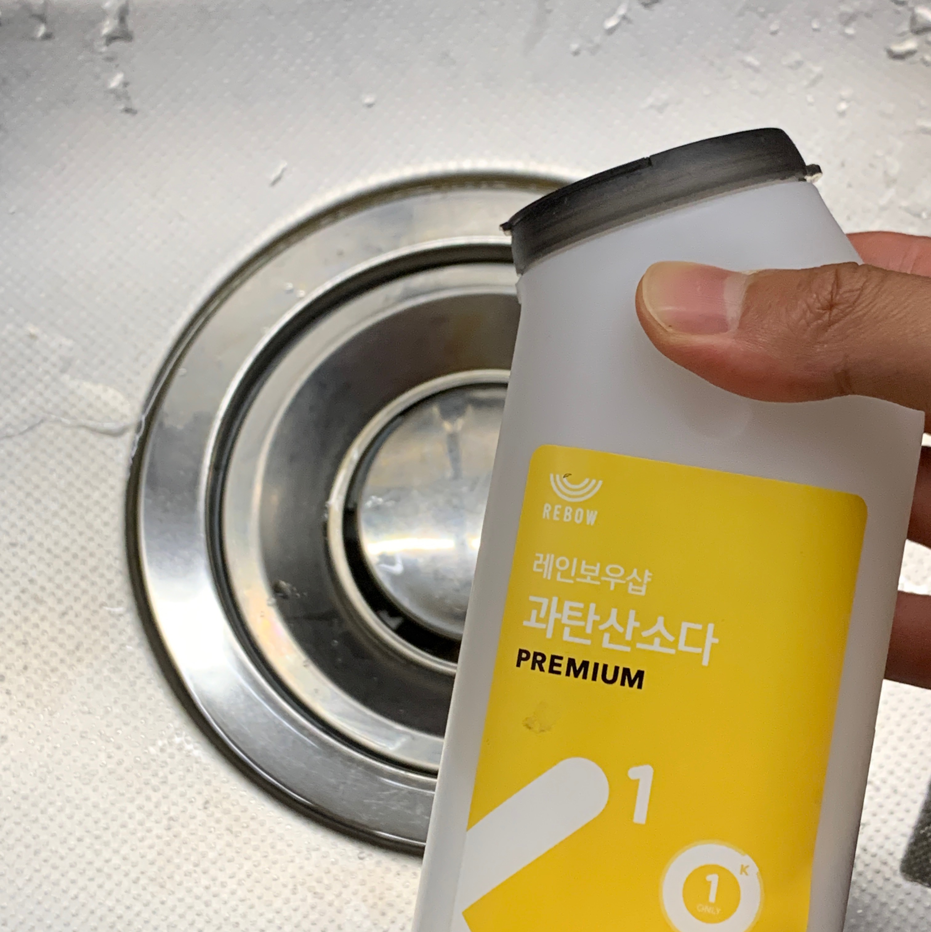 이렇게 싱크대에 남아있는 음식물 쓰레기를 볼 수 있는데요, 남아있는 음식물 쓰레기를 꼭 비워야 집 안에 냄새가 안 날 거 같네요;;; 그리고 배관 속 남아있는 찌든 때를 청소하기 위해서 과탄산소다를 사용할 텐데요. 가격은 비싸지 않으니, 대용량으로 한번 구입하시면 이리저리 쓸데가 많은 놈이니 구비해 두시는 걸 추천드립니다!! (표백, 살균, 세탁보조, 피 얼룩제거, 싱크대 하수 청소)
