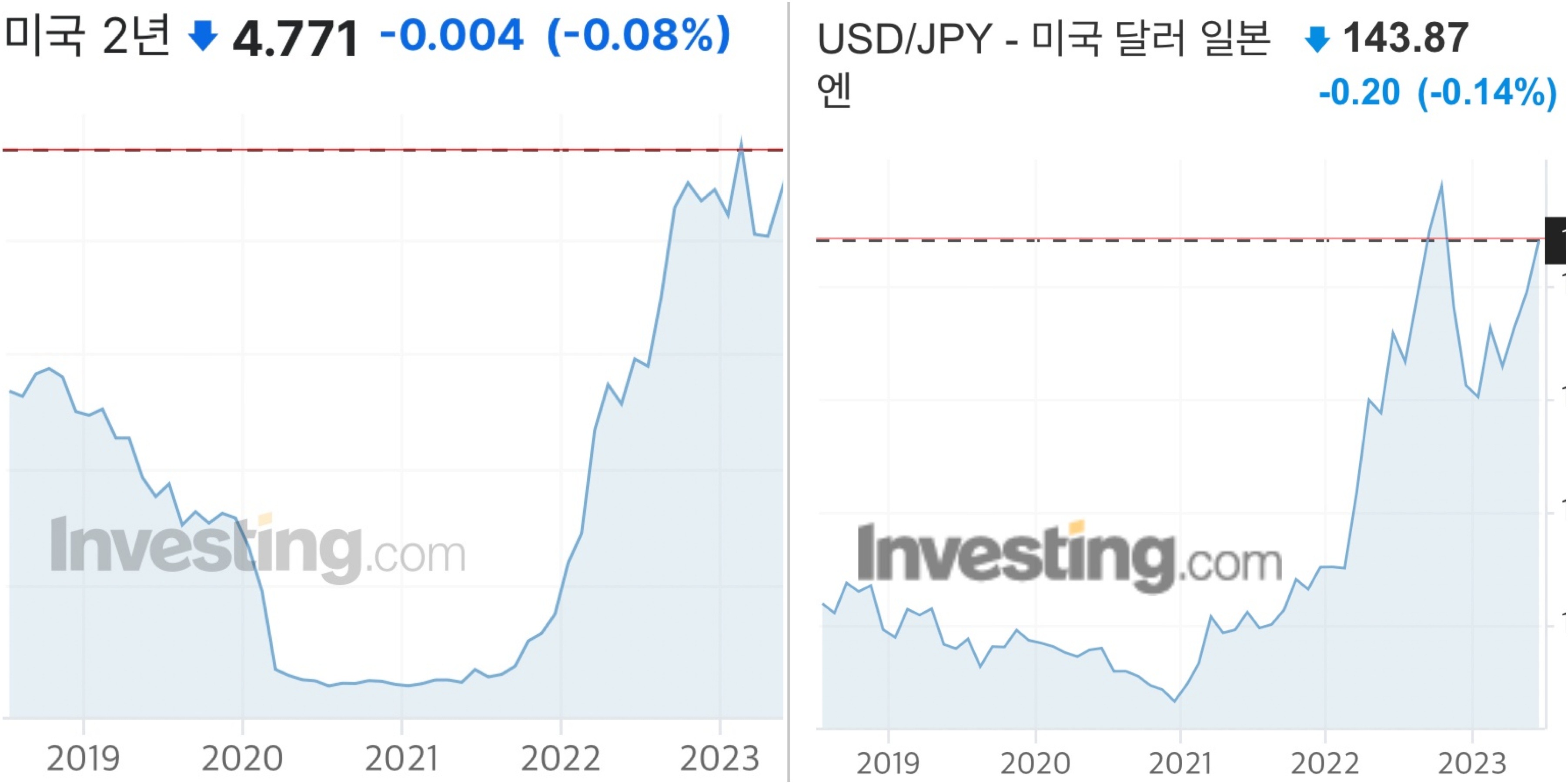 달러-엔 환율이 높아짐에 따라 23년 7월 현재 1달러당 140~145엔 사이에 있는데요. 지난 22년 9월 달러-엔 환율이 150엔 가까이 찍었을 때 일본은행이 했던 행동을 본다면 일본이 바라보는 최저 엔화 약세가 어느 정도인지를 알 수 있습니다. 달러-엔 환율이 150엔 가까이 도달하자 일본 은행은 국채를 사들이는 직접적인 개입을 시행했습니다. 즉, 1달러당 145~150엔 환율 수준을 일본 은행의 심리적 저항선, 개입할 수 있는 환율의 영역이라고 보고 있습니다.