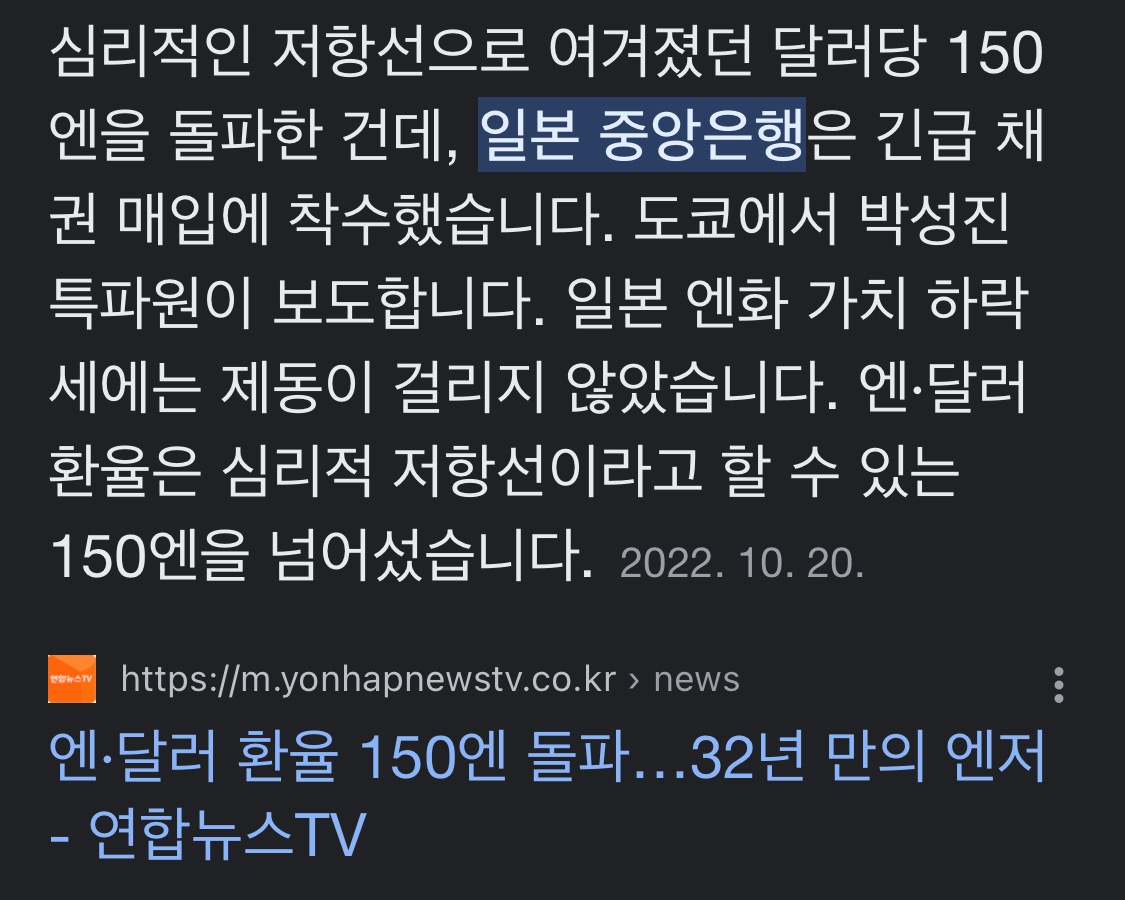 일본 은행도 150엔 이상으로 일본 엔화의 약세가 지속되기에는 견딜 수 없다 생각하기 때문에 일본 채권을 일본 은행이 직접적으로 구입함으로써 시장에 나와있는 엔화 자금을 줄여 엔화의 가치를 더 이상 떨어지지 않게 하려고 합니다. 지금 140~145엔 수준을 보이고 있으니, 심리적 상한선에 거의 도달한 것으로 보여 지금이 일본 엔화의 최저점에 가까이 도달했다고 볼 수 있을 것 같네요.